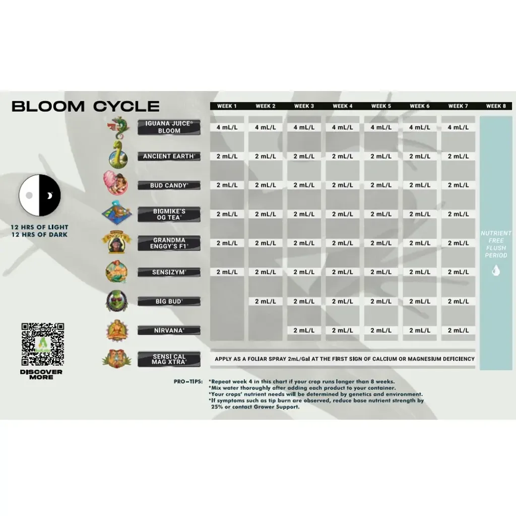 - Applicera Advanced Nutrients Organic Iguana Juice Bloom under blomningen av dina växter, enligt det rekommenderade schemat från Advanced Nutrients.